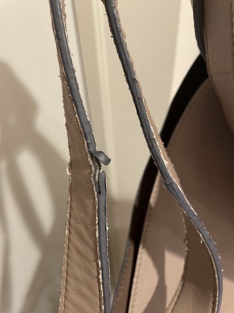 人気の高いステラマッカートニー、感触がよく軽めで使いやすいのですが合皮であるが故に表皮が浮く剥がれる等のトラブルが発生します。広い面積で剥がれたり浮いたりしているものは補修は困難な場合はありますが綺麗に直せます。